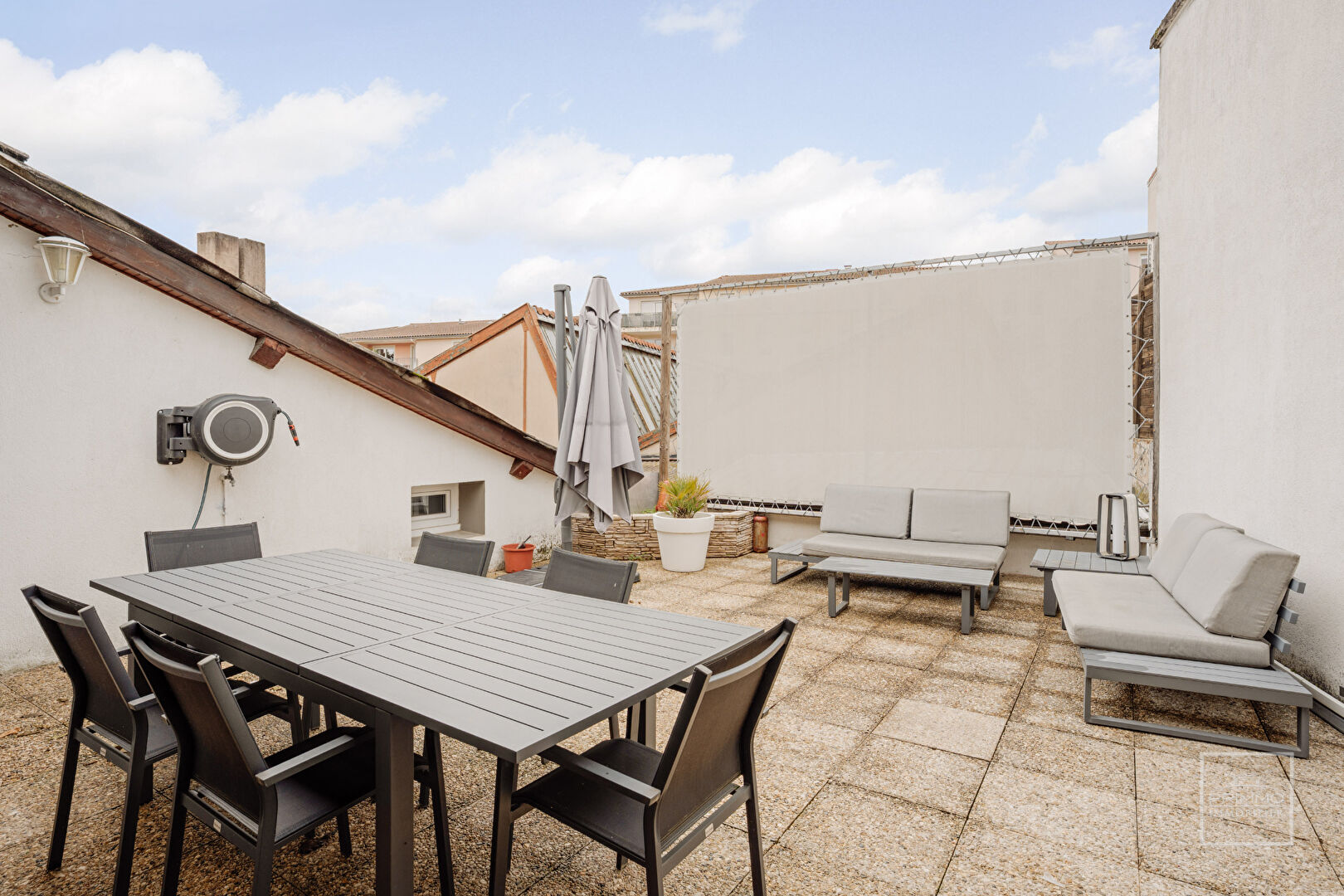 Appartement au 1er étage d'une superficie d'environ 270m², proche du centre ville de Neuville-sur-Saône et ses commerces, composé comme suit : Un double séjour avec rangements de 91m², 5 chambres dont deux en suite avec leur salle d'eau et trois des cinq sont climatisées, une cuisine aménagée et équipée ainsi qu'une buanderie. Les deux séjours donnent sur une terrasse privative de 41m². 2 places de stationnement en enfilade complètent ce bien. Les charges comprennent la taxe d'enlèvement des ordures ménagères, l'entretien de la chaudière et l'entretien de la pompe à chaleur. Disponible à compter de début janvier 2026.